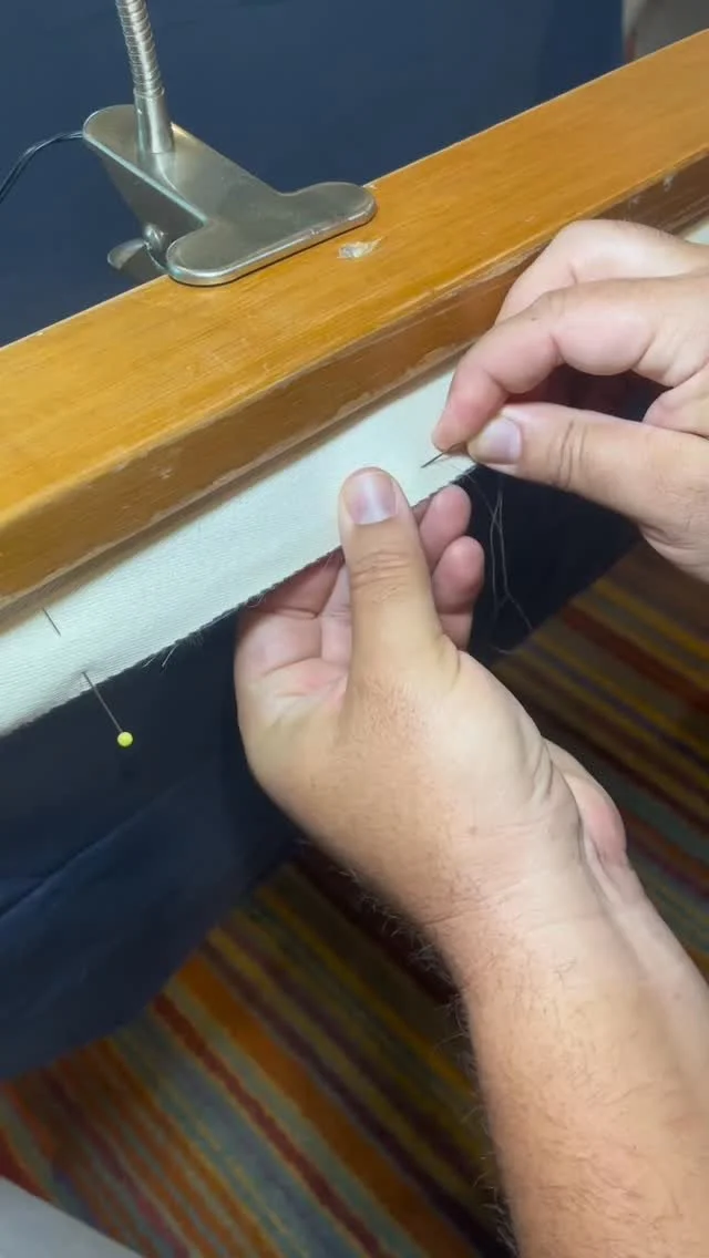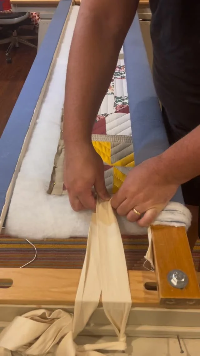 Once the quilting stitches reach the opposite side of the quilt, which is typically a few months later, I loosen the tension on the frame. The side straps are removed and the quilt is cut out along its perimeter. I then sew around the edge of the quilt and prepare the binding, which conceals the raw edge.